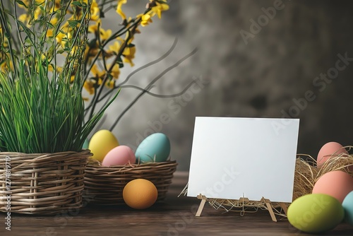 Easter Decorations with Colorful Eggs and Blank Card on Wooden Surface - Template