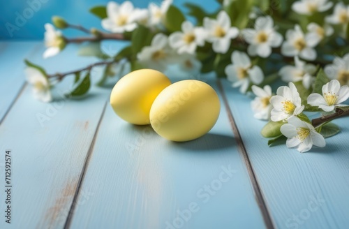 Easter Eggs with Spring Flowers on a Blue Background, Colored Holiday Egg Card