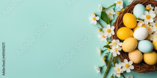 Easter holiday background flat top view. On the table there is an Easter basket with colorful eggs and beautiful spring flowers