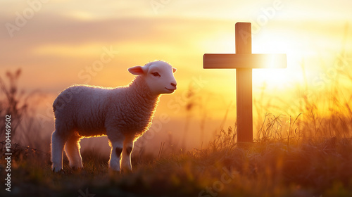 Easter lamb silhouette standing near wooden cross at sunset with warm glow