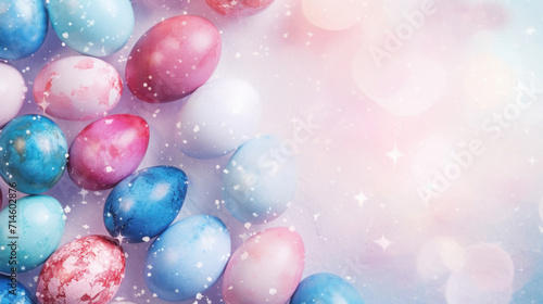 Easter magic comes alive with a dreamy display of Easter eggs adorned with a starry glow, nestled in soft pastel shades and festive sparkles.