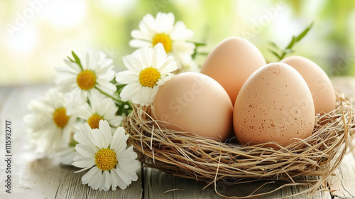 Easter nest with chicken eggs and daisies on a green bokeh background.