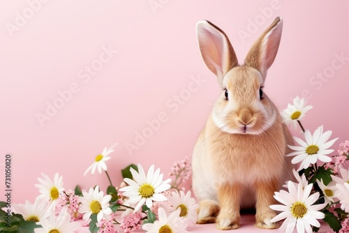 easter rabbit with flowers, easter bunny illustration on pink background, copy space
