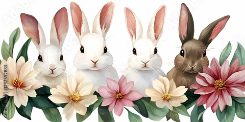 Easter watercolor concept. Four rabbits surrounded by colorful flowers in a whimsical design.