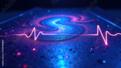 ECG Printout, A glowing ECG printout resembling a galaxy path on a reflective metallic surface in neon blues and purples