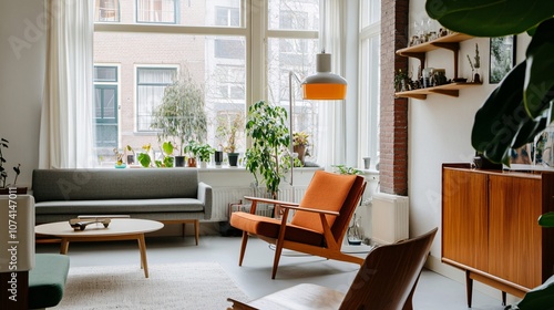 Eclectic Amsterdam living space, vintage mid-century furniture, modern minimalist accents, large windows with canal views, warm ambient lighting, exposed brick, designer details, hygge atmosphere,