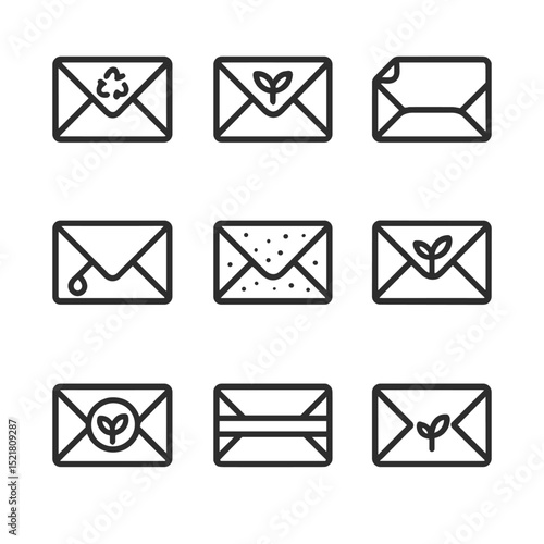 Eco Envelope Icons. Outline icon set of eco-friendly envelope options: recycled paper, seed paper envelope, compostable liner, soy