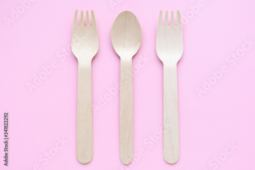 eco friendly disposable kitchenware utensils on pink background. wooden forks and spoons. ecology, zero waste concept. top view. flat lay.