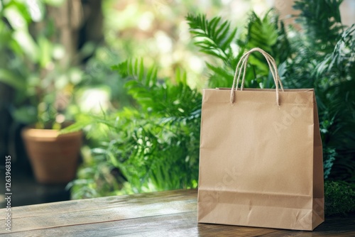 Eco friendly paper bag displayed on a wooden table with lush green plants in a vibrant natural setting. Generative AI