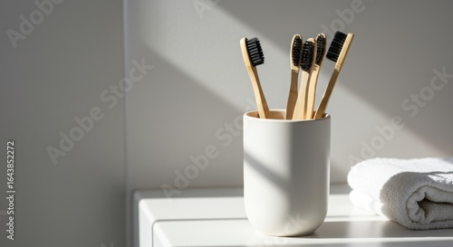 Eco-Friendly Bamboo Toothbrushes in Ceramic Holder with Towel in Sunlight