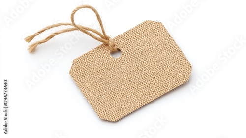 Eco-friendly Kraft paper tag, biodegradable ink, emphasizes sustainability, minimal waste, isolated on a clean white backdrop.