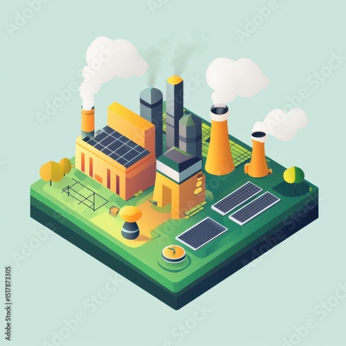 Eco-friendly power plant with solar panels, smokestacks, and grassy terrain.