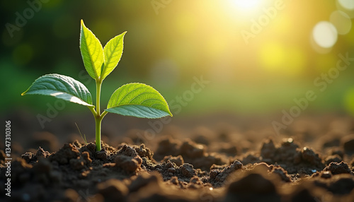Ecology and afforestation with young sapling in soil under sunlight, tree planting volunteers