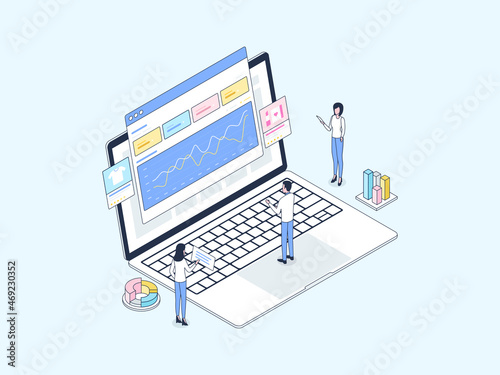 E-Commerce Analytics Isometric Illustration Lineal Color. Suitable for Mobile App, Website, Banner, Diagrams, Infographics, and Other Graphic Assets.