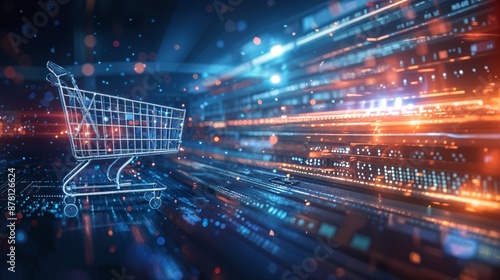 e-commerce blue to transactional silver background with pixelated motifs of shopping carts