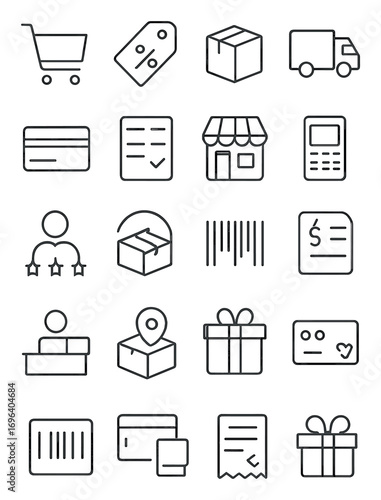 E-commerce business icons icons in minimalistic line art style: shopping cart, discount tag, package box, delivery truck, credit card, order form,