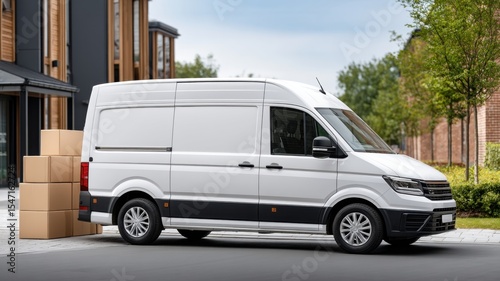 Ecommerce, Online Business, delivery box. Delivery van parked near stacked boxes in a modern urban setting.