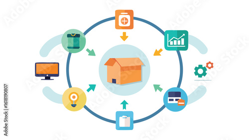 Ecommerce supply chain illustration depicts products and logistics from concept to delivery,showcasing retail management,marketing strategy and product optimization within a cohesive business model