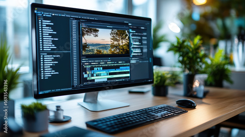 Editing software on monitor, workspace with plants, modern technology, creative process