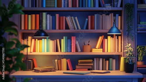 Education & E-learning Cozy bookshelf illuminated by warm lights in a serene setting. Unique and Creative Concepts