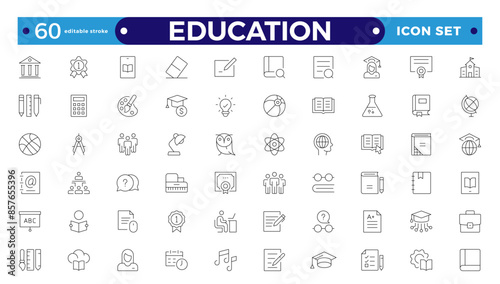 Education and learning icon set Outline vector icons related to education, success, academic subjects, and more. Editable stroke outline icon.