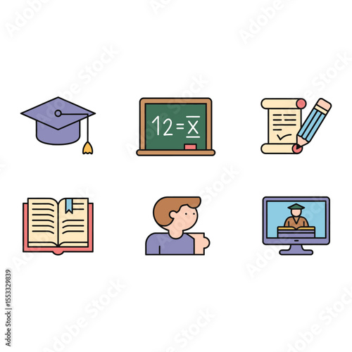 Education and learning icons depicting graduation studying online textbook knowledge and schooling