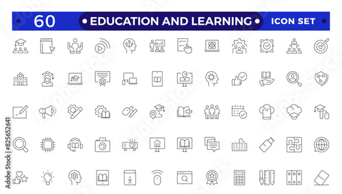 Education and Learning Outline icons set. Education, School, Learning, university, textbook.Containing video tuition, e-learning, online courses, educational websites, and digital education icons.