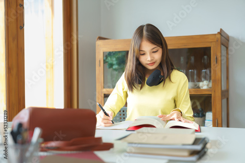Education and literacy concept, College student girl reading textbook and taking notes in library