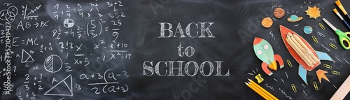 education. Back to school concept over blackboard background. top view, flat lay