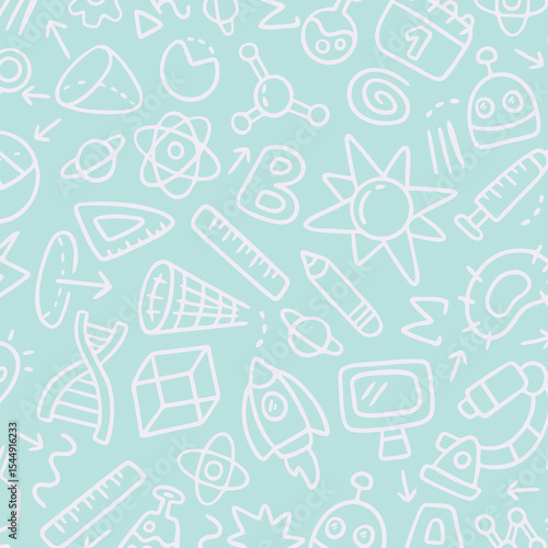 Education doodle seamless pattern. Science line hand drawn elements - mathematics formula, chemistry molecule, dna, graph, scientific experiment vector repeated background