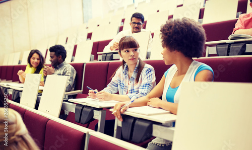 education, high school, university, learning and people concept - group of international students talking on lecture