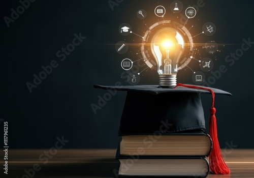 Education learning and Idea knowledge concepts innovative technology . Graduation cap with a lightbulb on the book and icon learning in the classroom