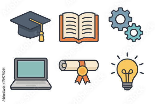 Educational tools flat icon set. featuring graduation cap, open book, gears, laptop, diploma, and light bulb symbols