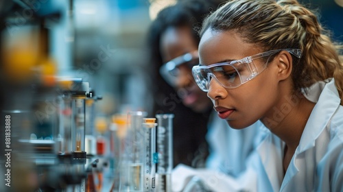 Educator demonstrating a physics experiment in a laboratory setting Stock Photo with copy space
