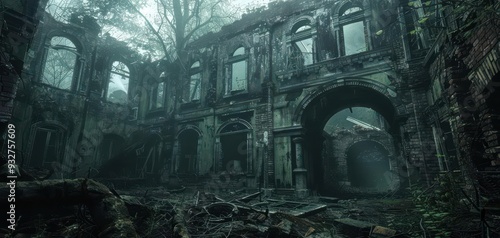 Eerie abandoned mansion ruins overgrown with greenery and enveloped in mist, capturing haunting decay in a forgotten, mysterious location.