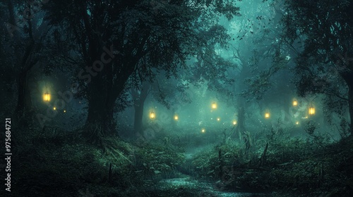 Eerie Forest Clearing Enveloped in Ghostly Lights with Ancient Spirits Gathering and Whispering