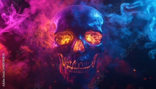 Eerie Glowing Skull Face in Blue and Pink Smoke on Dark Background