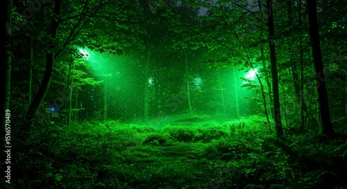 Eerie green glow illuminates a misty forest path at night, surrounded by lush foliage and tall trees