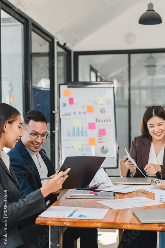 Efficient business meeting with professionals discussing data and strategies. Engaged team members collaborate using laptops and documents, showcasing teamwork and productivity