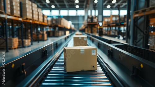 Efficient Conveyor Belt System in a Distribution Warehouse – Perfect for Logistics, Industrial Operations, and Supply Chain Management Illustrations Showcasing Streamlined Workflow