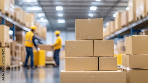 Efficient Global Logistics: Neatly Packaged Products for Shipment with Workers Moving Boxes in Background
