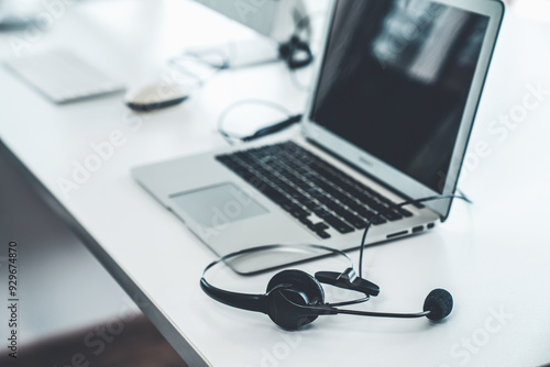 Efficient Remote Workstation Setup: Laptop and Headset on Minimalist Desk for Seamless Communication and Productivity in a Home Office or Call Center Environment