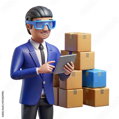 Efficient Warehouse Management 3D Render of a Manager Using Tablet to Optimize Logistics and Inventory