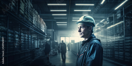 Efficient Warehouse Worker on Bright Factory Background. Generative AI