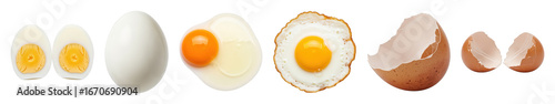 Egg set including whole, cracked, fried, hard-boiled halves, and broken shells isolated. Healthy food and cooking collection.