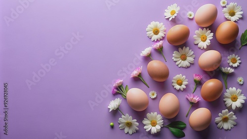 Eggs and flowers arranged on lilac background with empty copy space area, Easter, spring, decoration, colorful, festive