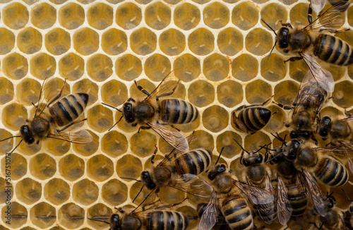 Eggs in honeycombs. Queen bee laid eggs in honeycombs