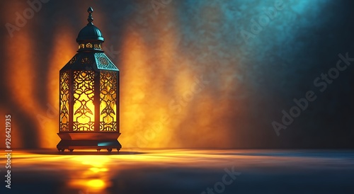 Eid Mubarak and Ramadan Kareem greetings with an Islam crescent, lantern, mosque banner backdrop