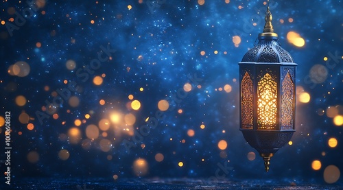 Eid Mubarak and Ramadan Kareem greetings with an Islamic lantern behind the Arabic lamp on a blue background.