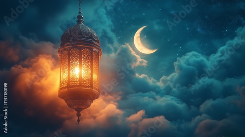 Eid Mubarak and Ramadan Kareem greetings with an Islamic lantern, mosque, and Eid al-Fitr background with a moon and clouds